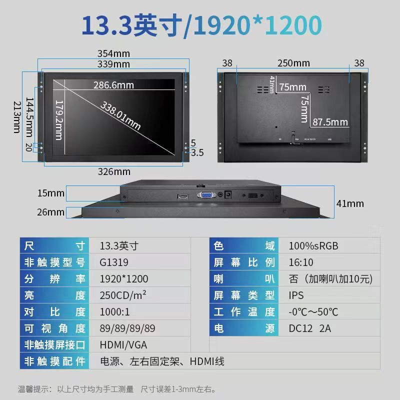 13.3寸開放式高清顯示器1920*1200IPS屏全視角100%SRGB工業顯示器
